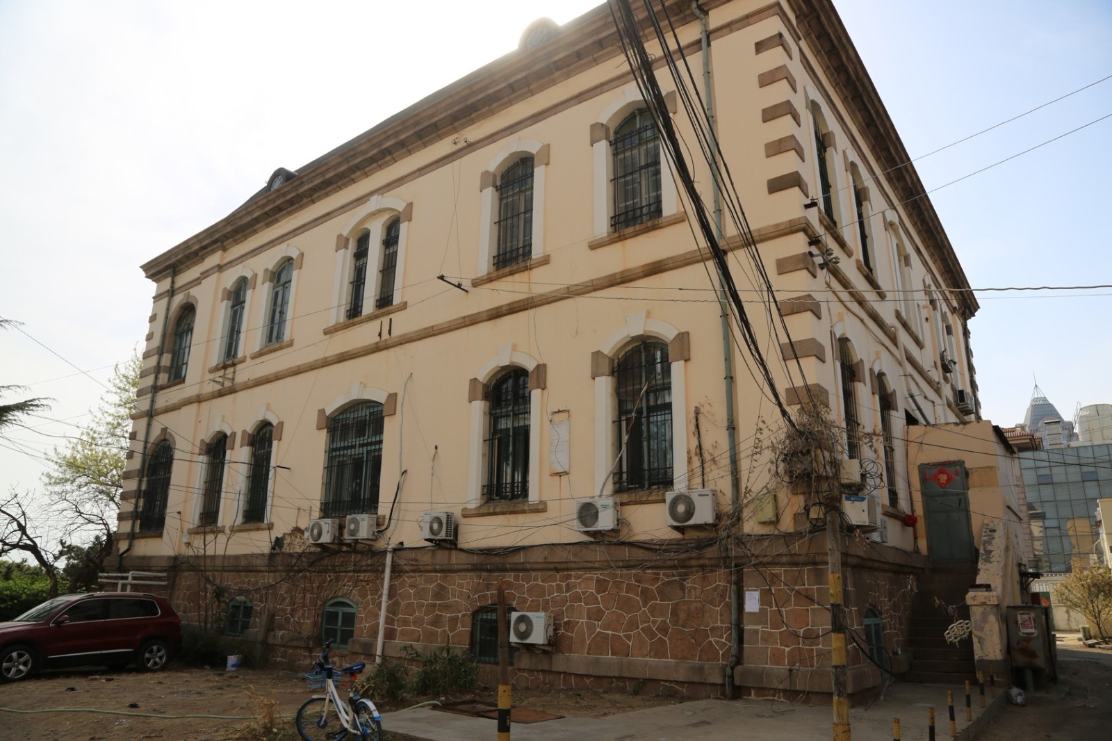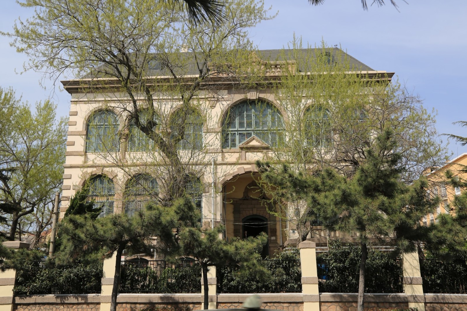 德華銀行舊址,位于市南區(qū)廣西路14號(hào)。德國建筑師海因里?!ゅa樂巴和路易斯·魏爾勒設(shè)計(jì)。采用19世紀(jì)意大利文藝復(fù)興式建筑風(fēng)格,德國三段式建筑,磚木結(jié)構(gòu)。占地約8307平方米,建筑面積562平方米。青島歷史上第一家銀行建筑,磚木結(jié)構(gòu)。地上二層并設(shè)有半地下室,屋頂為青黑色,留有很小圓形老虎窗的蒙莎頂,西面和南面設(shè)兩層通風(fēng)的券柱式外廊。高約4米。外墻為多孔式沙漿抹面,建筑四角鑲有隅石。