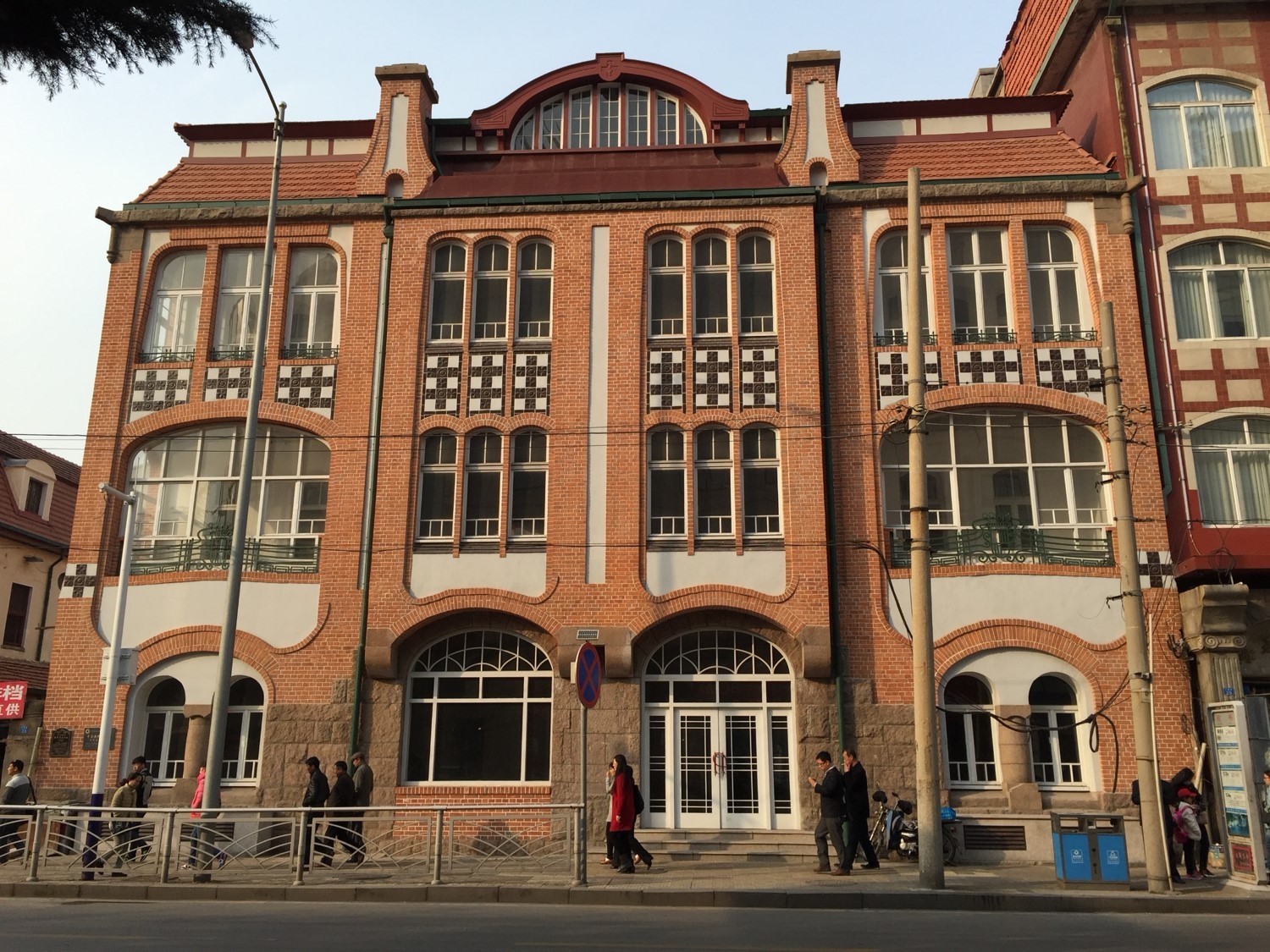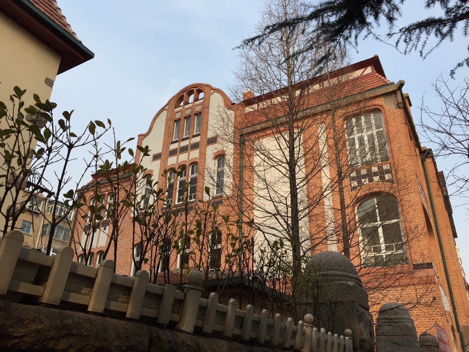 醫(yī)藥商店舊址,位于市南區(qū)廣西路33號。由德國人庫爾特?羅克格設(shè)計,又名橡樹飯店,建筑面積約1960平方米,使用面積約1000平方米。青島市最早的商業(yè)建筑之一。建筑為巴洛克風(fēng)格,共四層,包括一層地下室和閣樓。立面以清水紅磚墻為主體,運(yùn)用拱券柱石,鑲石磚花飾,突出建筑外觀華麗、新奇。屋頂為蒙沙頂配有拱形老虎窗,檐口用花崗石裝飾。室內(nèi)均由木地板鋪鑲,做工精細(xì)。