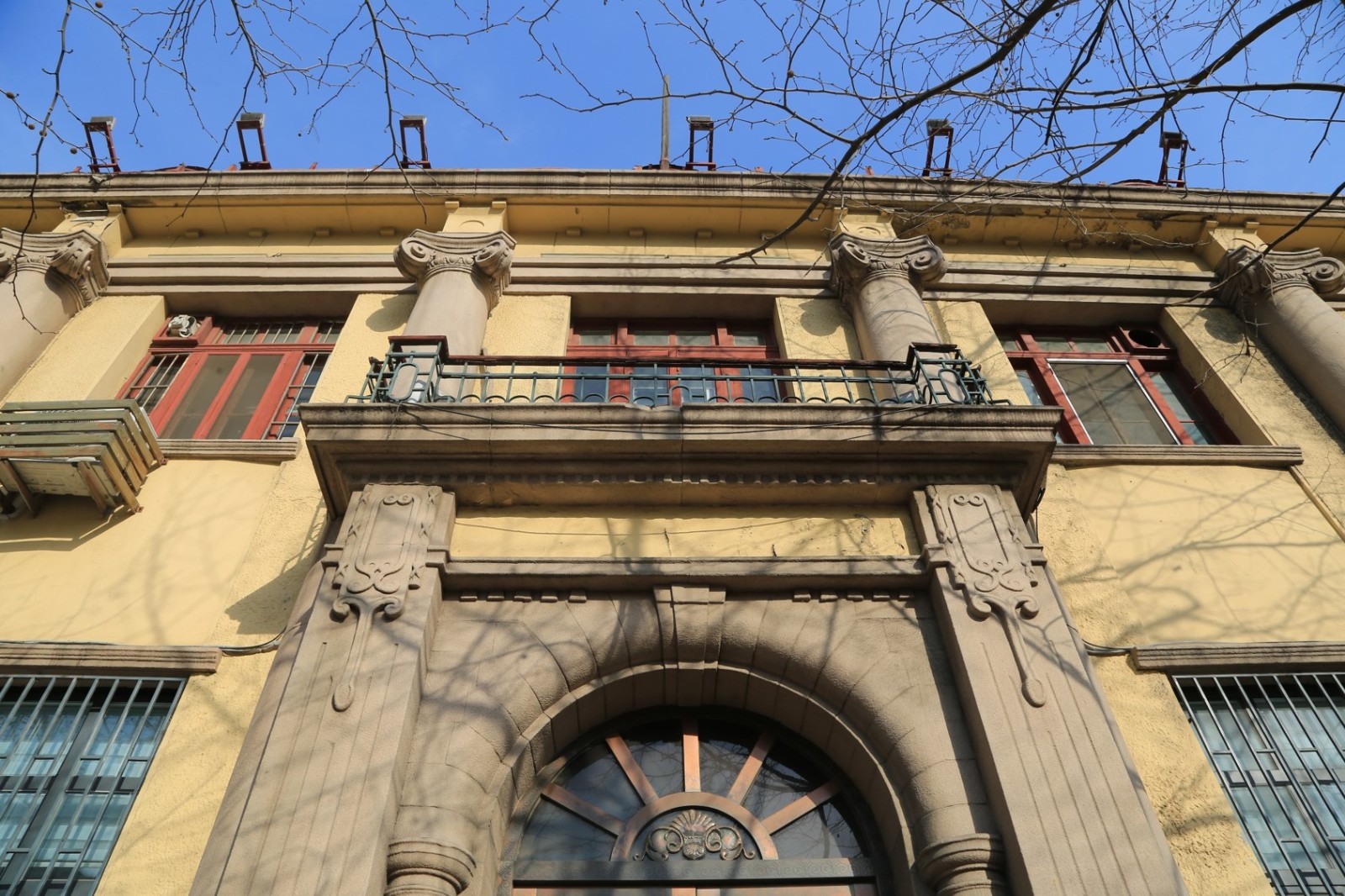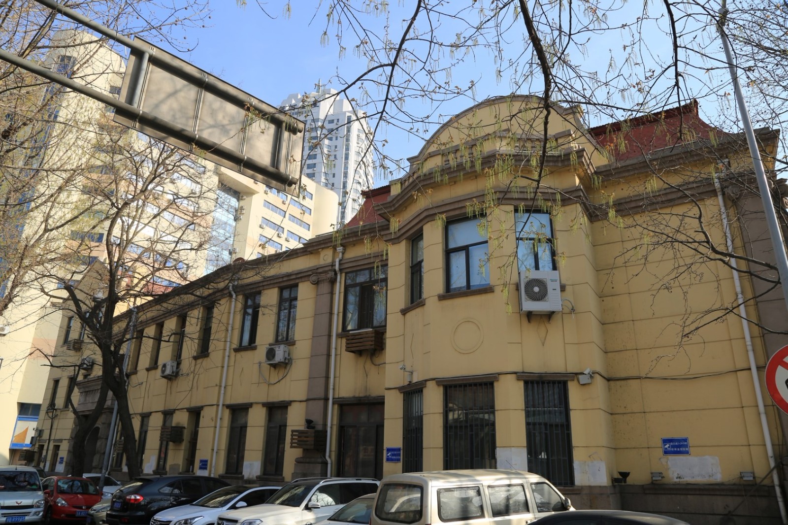三井洋行舊址,位于市北區(qū)堂邑路11號(hào)。占地面積約1466平方米,建筑面積約2980平方米。樓高二層,磚石木結(jié)構(gòu),平面呈L形。大體分西、北兩部分,西部為主體。正門西向,中軸線對稱,左右墻角各有三根羅馬式圓形貼面石柱,凹形水刷石墻面,花崗石砌基,多角折坡絳紅色牛舌瓦屋面。入口處為4根羅馬半圓形貼面石柱,登7級(jí)臺(tái)階有挑廊,上為半圓式露天涼臺(tái)。