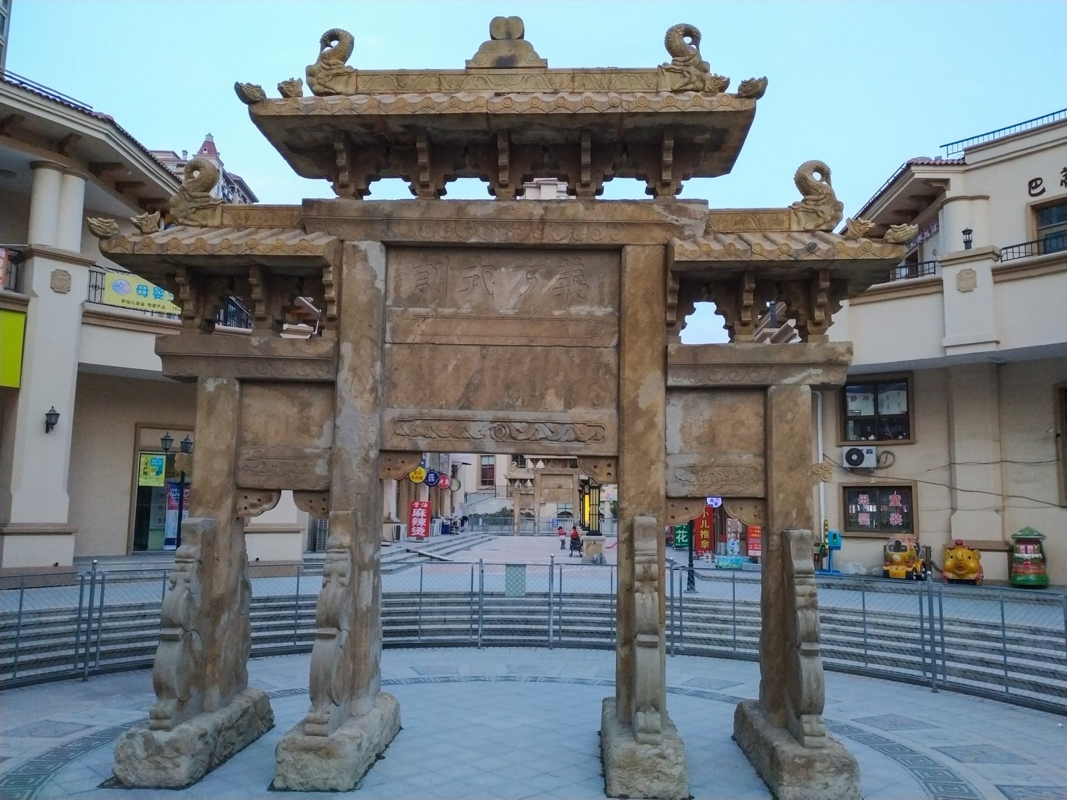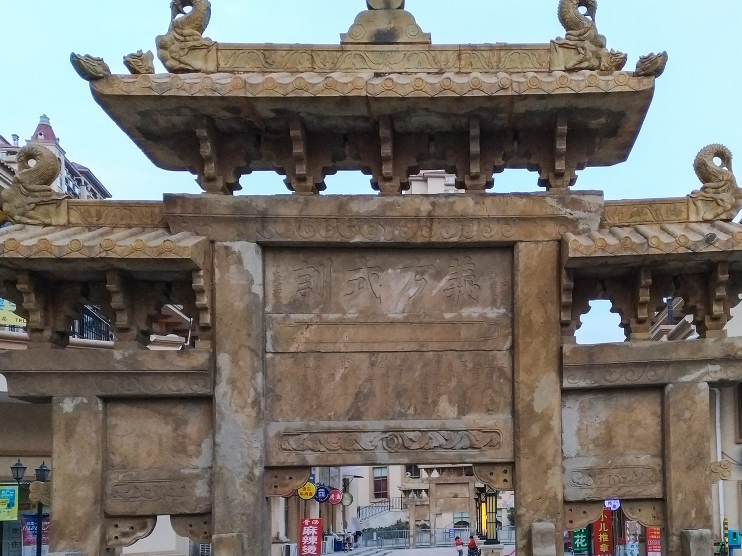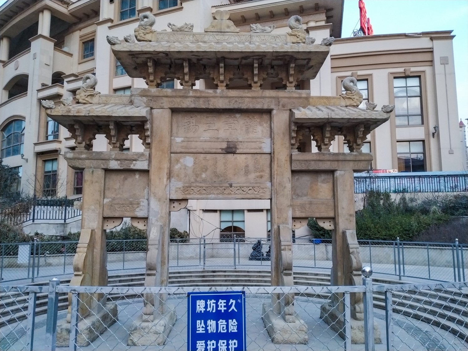 大棗園牌坊為一處兩座,間距為60米。形制及大小基本相同,皆為四柱三間,全石雕筑。頂部牌樓為斗拱承檐之仿木構(gòu)型,精雕細(xì)刻,氣勢(shì)不凡。東牌坊坊額兩面均橫刻“龍章三錫”四個(gè)楷書大字,下一層橫額豎刻王柱今的履歷;西牌坊坊額兩面均橫刻“義方式訓(xùn)”四個(gè)楷書大字,下一層橫額上豎刻王柱今的三個(gè)兒子和孫子王懿科舉應(yīng)考的名次。大棗園牌坊,是目前青島地區(qū)唯一幸存的一處功德石牌坊。