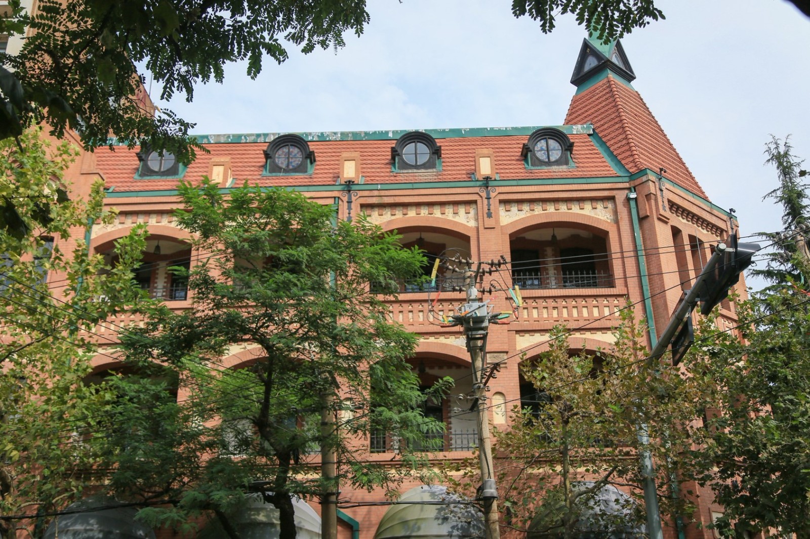 該建筑由德國漢堡阿爾托納區(qū)F.H.施密特公司承造,原屬馮·提帕斯基希公司私人商業(yè)大樓,后由德國膠澳總督府租下一層為郵政局。建筑面積約2230.23平方米(其中地下室222.18平方米),磚木結(jié)構(gòu)。地上三層,地下一層,有閣樓。主樓立面沿兩側(cè)街道走向呈非對稱鈍角形,花崗巖砌墻基,上部為紅磚清水墻,窗臺上方為連拱券廊。轉(zhuǎn)角部高起攢尖塔樓。西、南立面各有一曲線山花,高陡的屋頂開有弧形老虎窗,臨街的屋面覆以紅瓦,北面的平屋頂則用鐵皮鋪成。聯(lián)拱券廊,高陡屋頂上的弧形老虎窗以及主立面的山花增加了建筑的變化。當(dāng)時(shí)除一層為德國膠澳郵政局使用外,二、三層為宿舍,該建筑后來局部作了改造,凹廊裝玻璃窗,原有的細(xì)部裝飾在維修中改變。