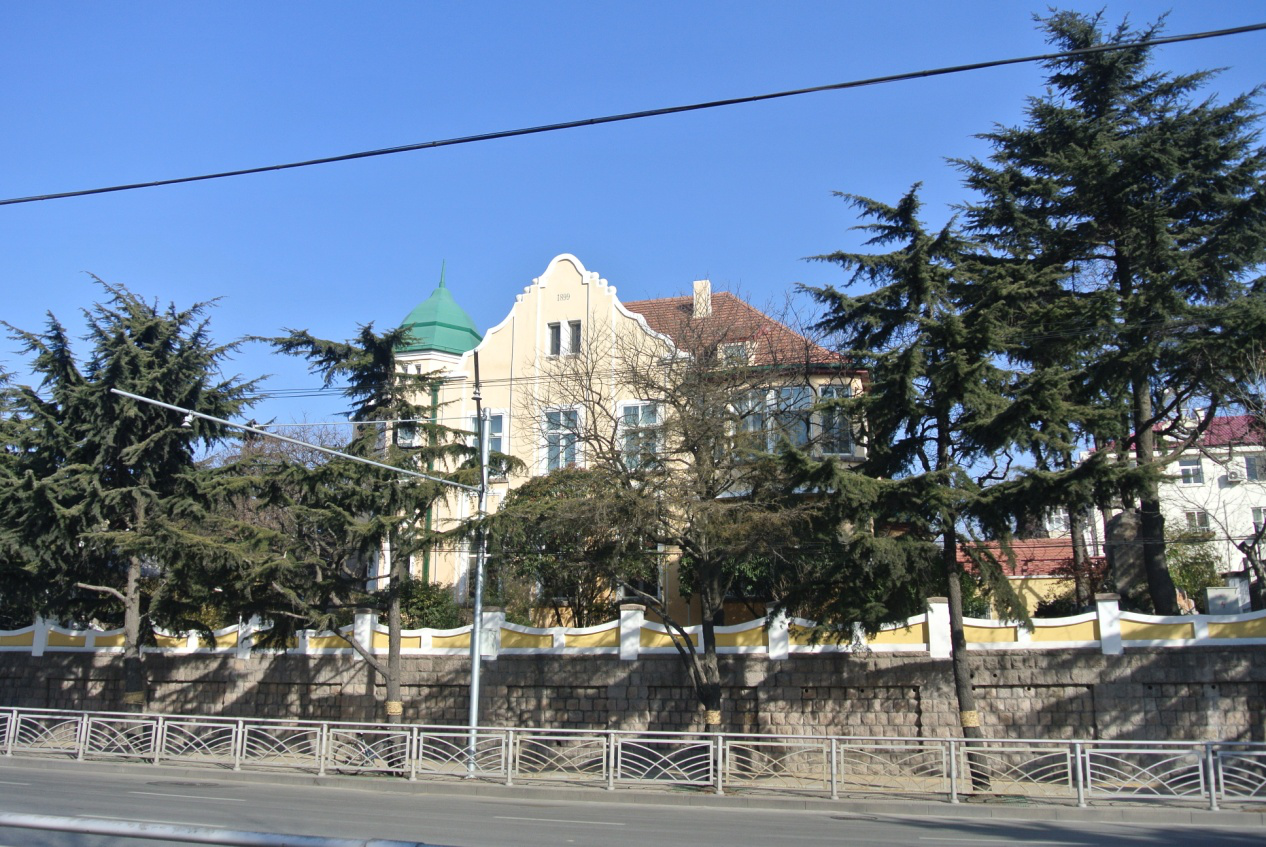 德國領事館舊址,位于市南區(qū)青島路1號,建筑面積約1165.4平方米,占地1408平方米。最初為德國奧爾格亞卜店斯基的私人寓所,后曾為德國領事館駐地。1947年孔士勸、孔令明等買下共有,1986年時任山東省政協(xié)副主席的孔令仁將該房捐贈給青島市人民政府,后辟為青島南園孔子紀念館。該建筑屬“三段式”別墅式建筑,磚木石結構,二層帶有閣樓和地下室。南面入口用粗獷的蘑菇石砌半圓券。大樓中部拐角取以圓形,上部八邊形尖頂塔樓,相鄰兩側山花式山墻成不對稱式。