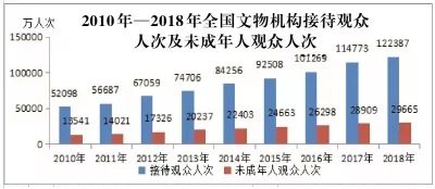 2018年全國各類文物機(jī)構(gòu)共舉辦陳列展覽27919個,比上年增加1874個。其中,基本陳列13676個,比上年增加651個;臨時展覽14243個,比上年增加1223個。接待觀眾122387萬人次,比上年增長6.6%,其中未成年人29665萬人次,增長2.6%,占參觀總?cè)藬?shù)的24.2%。博物館接待觀眾104436萬人次,比上年增長7.5%,占文物機(jī)構(gòu)接待觀眾總數(shù)的85.3%。